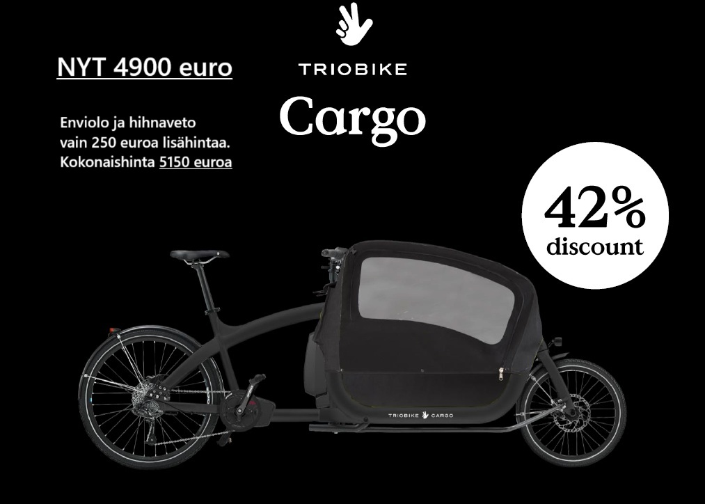 Triobike Cargo on kuljetuspyörä, jonka avulla voit toimittaa suuria kuormia nopeasti ja vaivattomasti kaupungin halki. Säästät kuljetuskustannuksissa, säästät ympäristöä ja säästät itseäsi turhalta stressiltä… olipa kyseessä sitten lapset, ostokset, painavat laatikot pienyrityksille tai “epätavalliset” tavarat, Triobike Cargo hoitaa homman. Sen kevyt alumiinirunko on uskomattoman vahva. Pyörä on suunniteltu nopeuteen ja ketteryyteen — ja se näyttää vieläpä upealta!